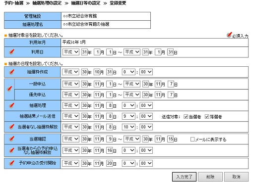 | 1. | 抽選対象日や、抽選処理日など抽選関連のスケジュールを登録します。 | |
