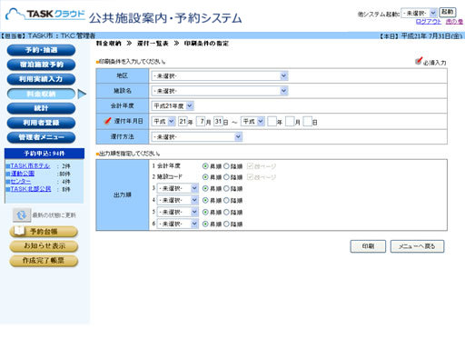 料金収納メニュー[還付済一覧表]では、会計年度をもとに、還付年月日を指定して還付データの一覧表を印刷できます。