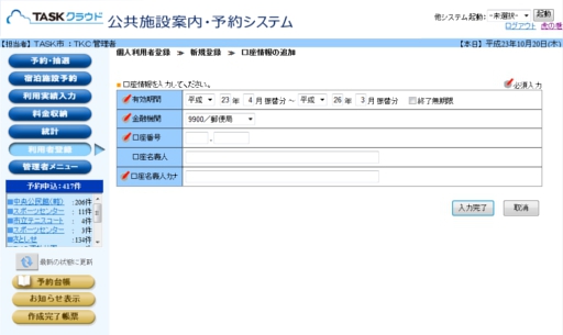 | 2. | 利用者情報を入力して[入力完了]ボタンをクリックします。 | |