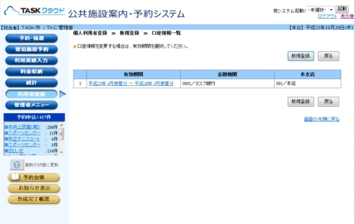 利用者登録メニューの<個人利用者登録>[新規登録]では、各施設の窓口で受け付ける利用者登録の入力を行います。 |