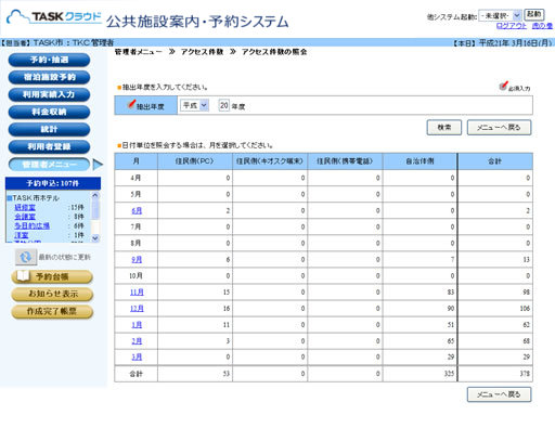 | 1. | 管理者メニュー[アクセス件数]では、年度を指定し、情報端末ごとのアクセス件数を照会します。 ・住民側(PC) ・住民側(キオスク端末) ・住民側(携帯電話) ・自治体側 |